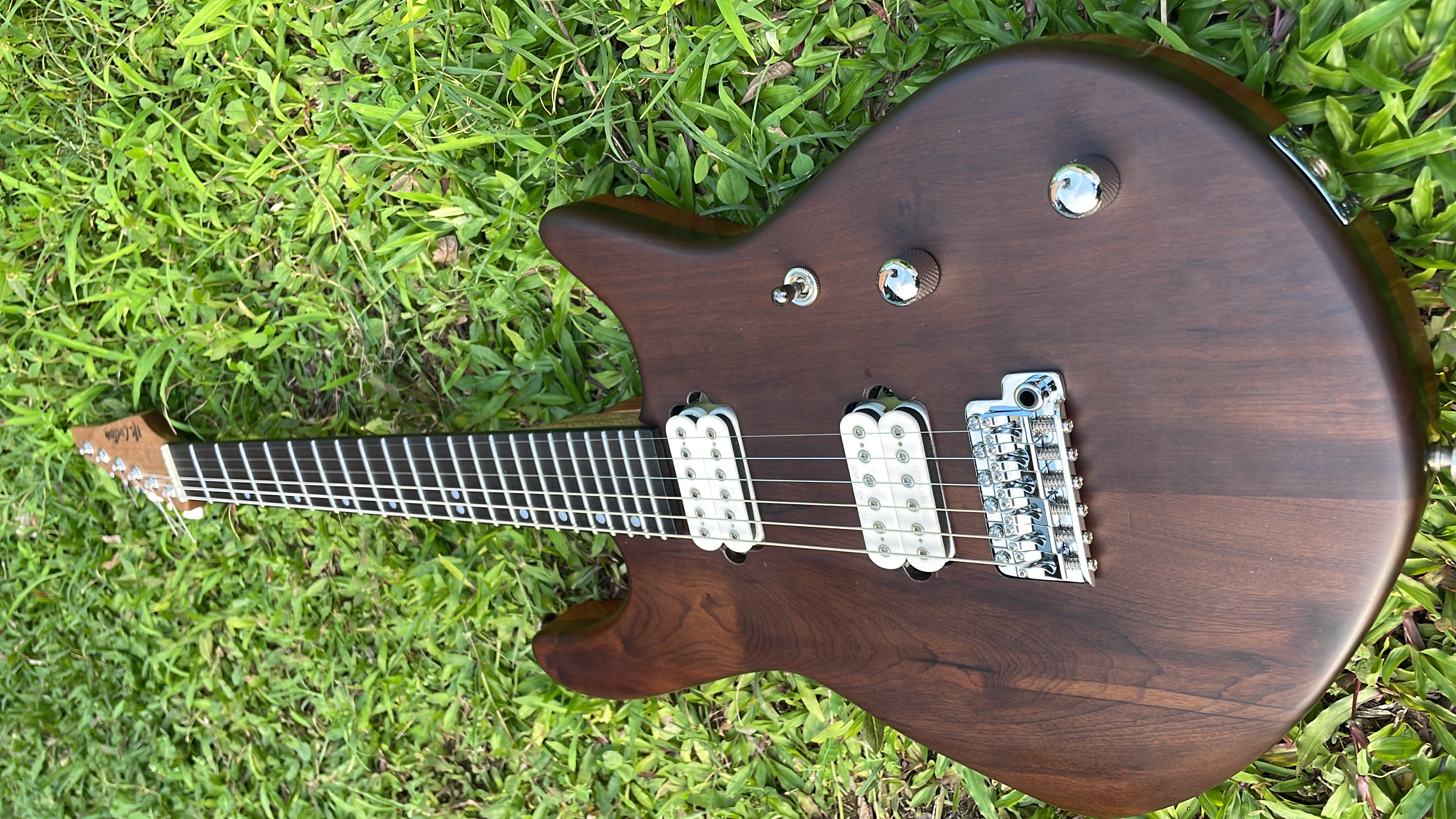 Guitarra Modelo Semi-Acustica: desenvolvida no ano de 2020, guitarra pensada na ergonomia do cliente com tamanho de corpo reduzido com escada de 24.75 polegadas, tendo as opções de 21 a 24 trastes, pensando no uso de cordas leves e pesadas com muito conforto, com acesso bastante facilitado nas regiões das notas agudas.